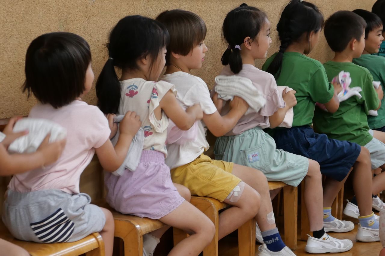 お風呂から出るときは「あがり湯」をかけ、浴用タオルで体の水分を拭きとってから脱衣所にあがります。「次の人が気持ちよく入れるように、お湯やバスタオルを汚さない、できるかぎりバスマットを濡らさないといいよ。」そんな先生の話を真剣に聞きながら、子どもたちは体や足の裏までも拭いていました。