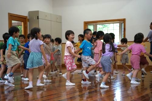 班別活動3回目の日、まずは風組と先生たちでフォークダンスを踊りました。楽しそうな笑い声が響いていました。