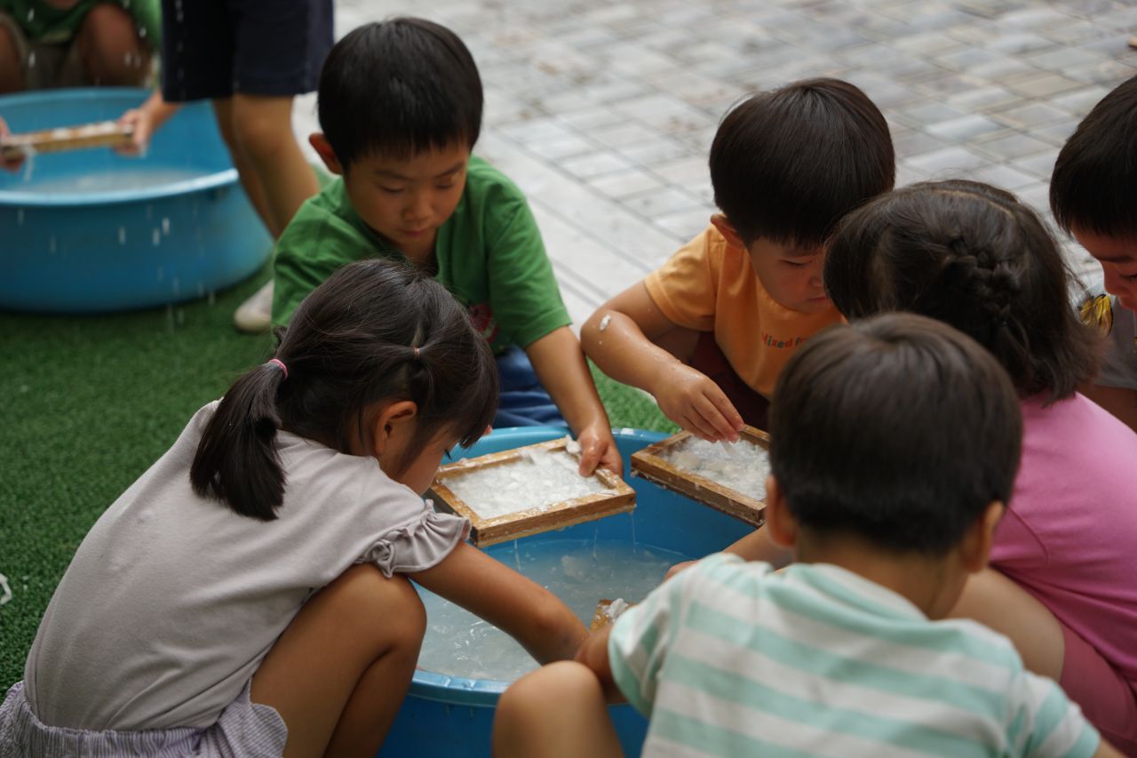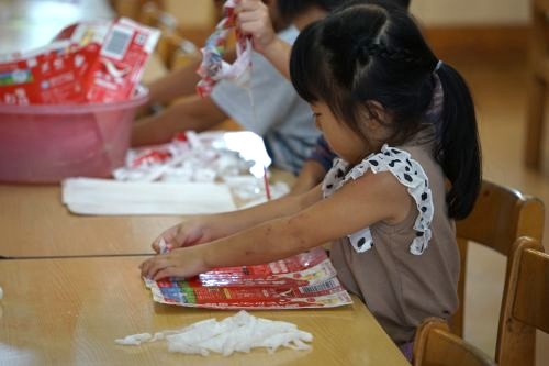 水と混ざりドロドロになった牛乳パックを試行錯誤しながら型にはめていました。