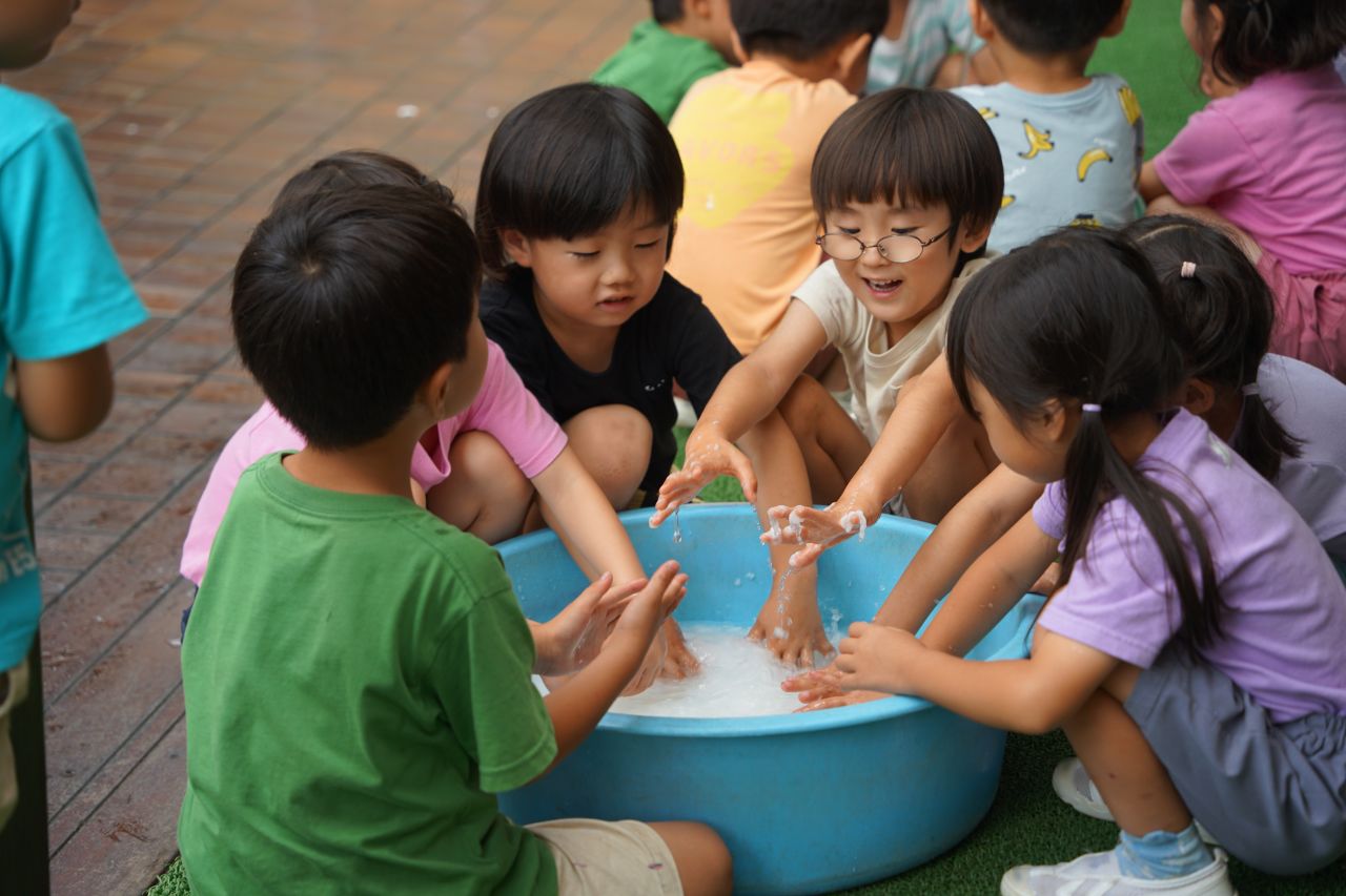 2回目の班別活動では、お風呂ごっこをしました。お風呂の入り方や体の洗い方を知ったり、周りの人への気遣いを学ぶ機会でもあります。頭に浴用タオルを乗せて、『かぜ…